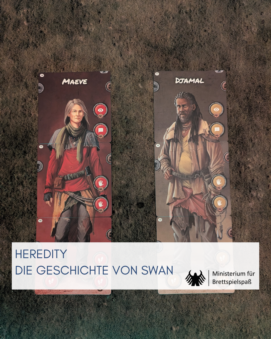 Die Mechanik dient insgesamt weniger als dominierendes Spielelement, sondern vielmehr als Mittel zur Intensivierung des narrativen Erlebens – und genau darin liegt eine der großen Stärken von HEREDITY. Die Komplexität ist bewusst dosiert, ohne das Spielgefühl einzuschränken. Ein schwieriger Balance-Akt, der hier gemeistert wurde. Nur bei den Erzählkarten wuchs mir der Verwaltungsaufwand manchmal ein wenig über den Kopf. Das lag aber sicherlich auch daran, dass die Vielzahl an Karten die Kapazitäten meines großen Campingtisches sprengte und ich irgendwann Karten über und untereinander legen musste.