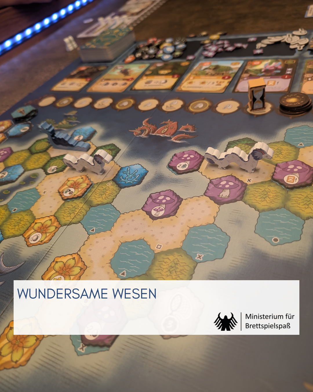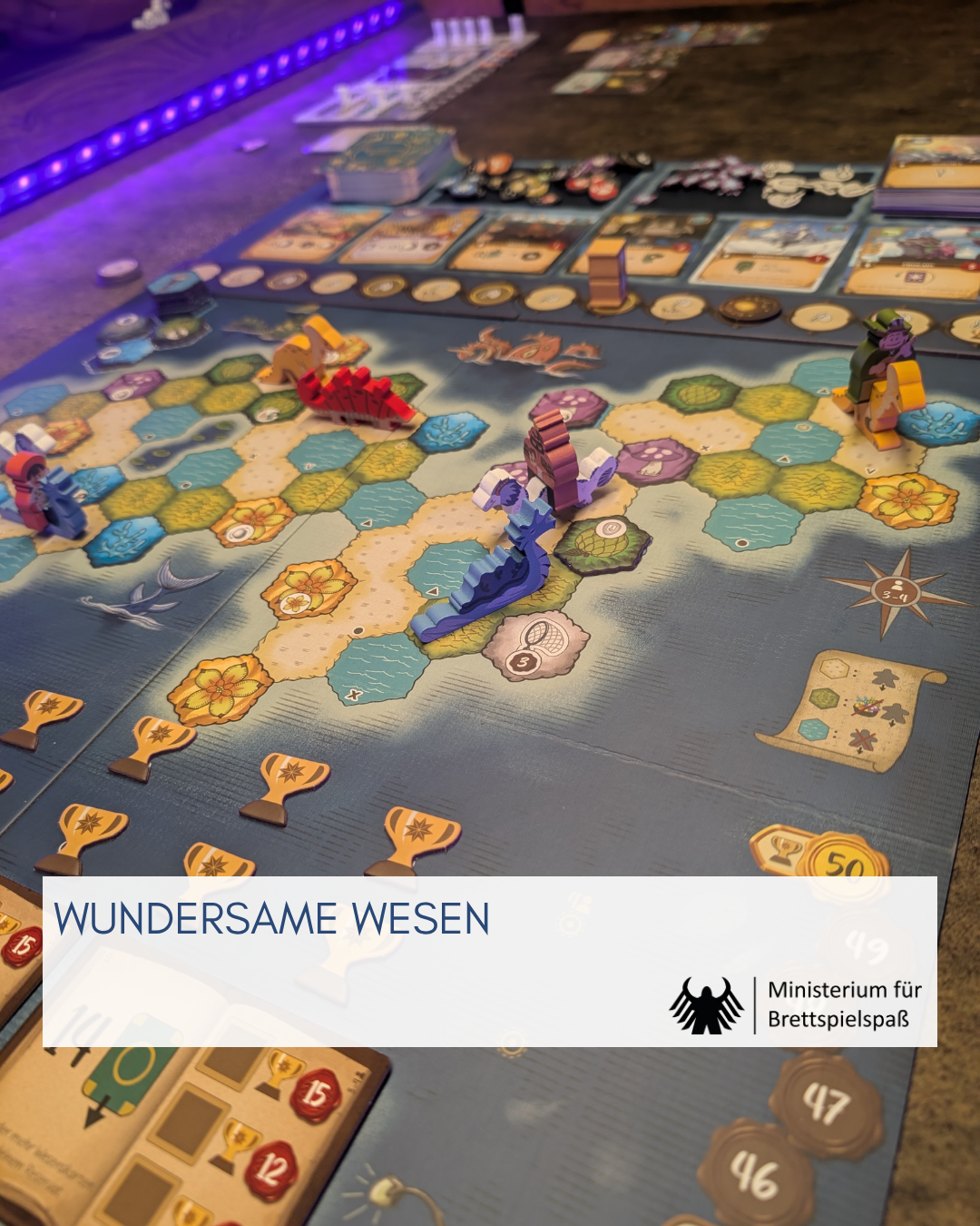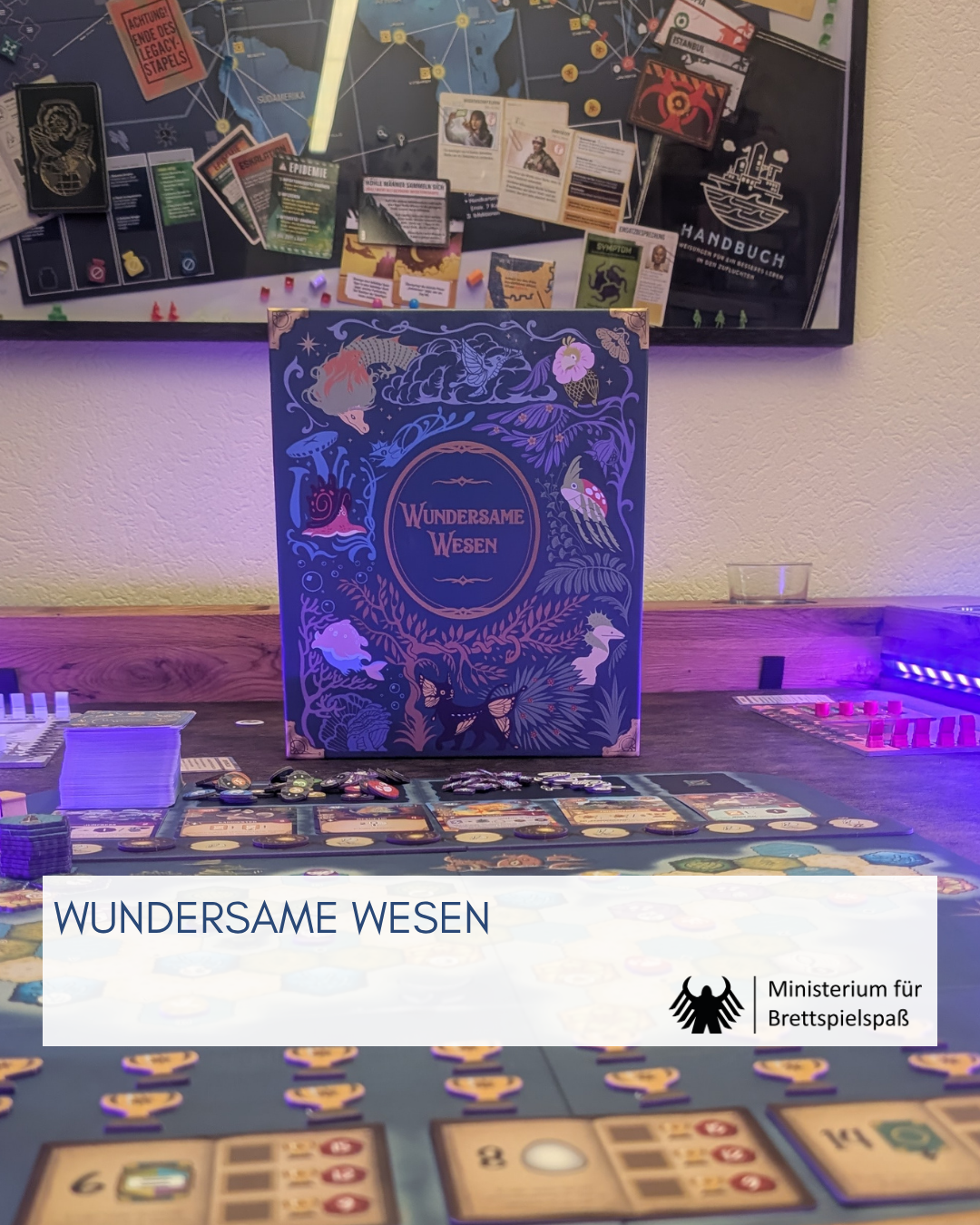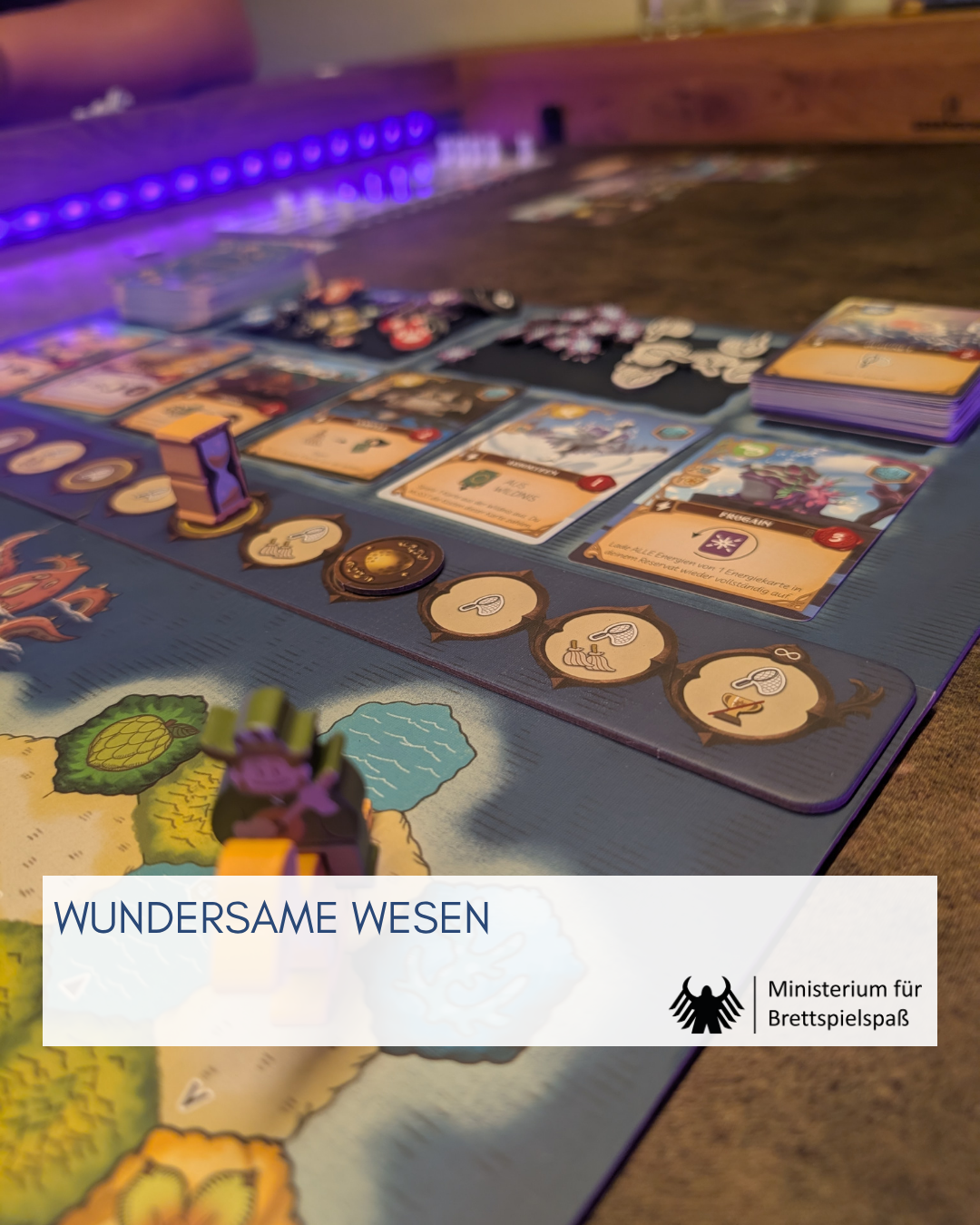 Am liebsten sehe ich mich als Teflon-Minister. Willensstark, über jede Kritik erhaben und vor allem immun gegen Hype. Zumindest rede ich mir das gern ein. Denn insbesondere die FOMO kickt bei mir regelmäßig. Wie neulich, als ich dann doch unbedingt noch WUNDERSAME WESEN haben musste. Dabei war ich dem Spiel recht lange entkommen. Die drohenden letzten Exemplare und relativ gute Besprechungen ließen meine Selbstbeherrschung bröckeln, und so wanderte das Spiel mit den putzigen Figuren auf der BERLINCON in meine Tasche.