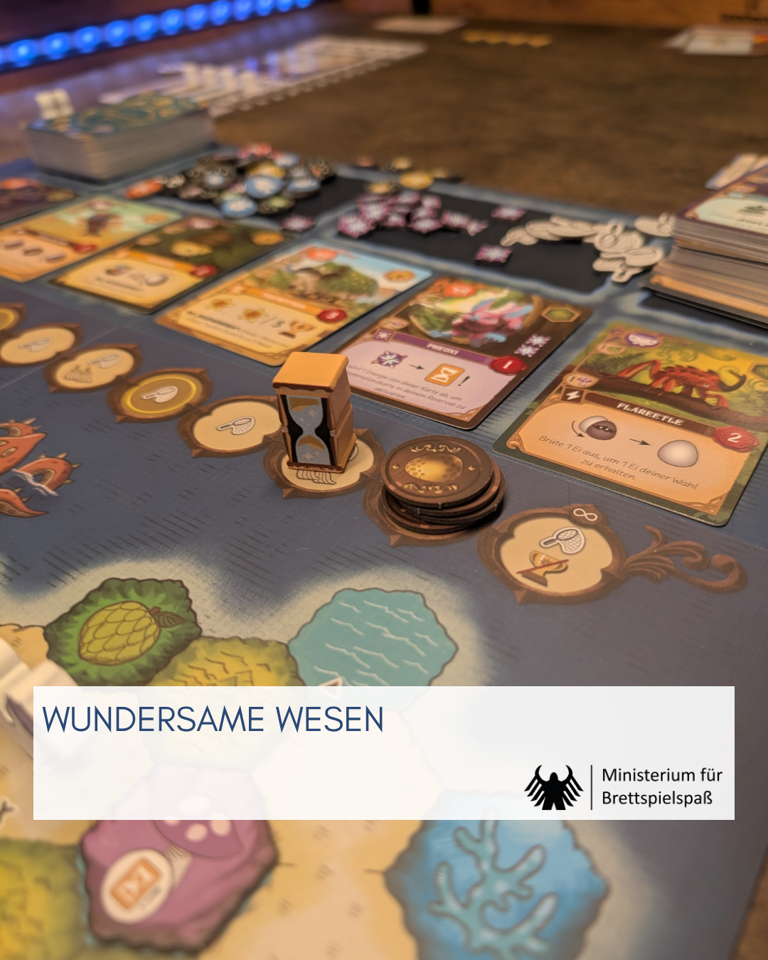 In meinen Partien empfand ich es als erfrischend, wie schnell wir uns stets durch den immerhin 126 Karten umfassenden Wesenskartenstapel arbeiteten. So komme ich nicht nur in den Genuss der vielen großartigen Abbildungen, sondern steigere auch meine Chancen, an die passenden Karten zu gelangen. Das war in Spielen mit ähnlich hohen Kartenstapeln, mit denen es oft verglichen wird, nicht immer so. Vor allem in ARCHE NOVA erschwerte die träge Auslage die Planung, weshalb die erste Erweiterung dieses Problem aufgriff. Hier ist fast das Gegenteil der Fall.