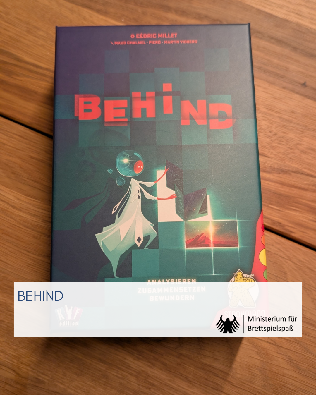 Bevor ich beginne, ein kurzer Hinweis: Dieses BEHIND ist das Rätsel-Lege-Spiel, das in diesem Jahr den französischen Spielepreis AS D’OR – JEU DE L’ANNÉE in der Kategorie INITIÉ gewonnen hat – nicht das gleichnamige Werk von 2003 von SEBASTIAN JAKOB und MICHAEL PALM. Letzterer ist erst nächstes Jahr wieder mit Gewinnen dran.