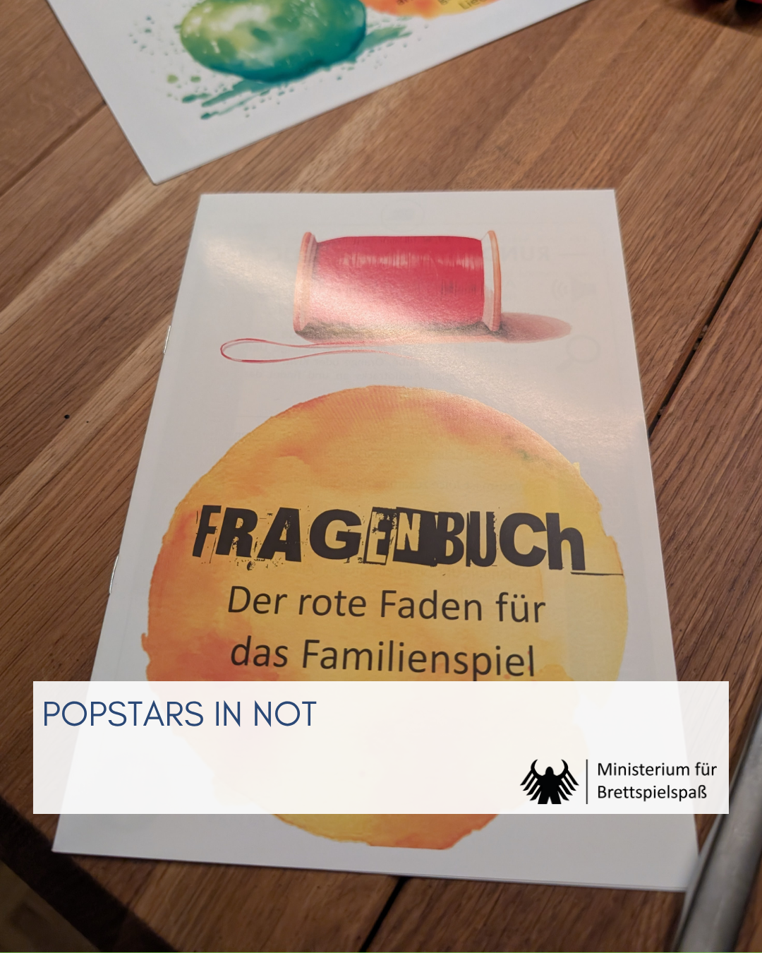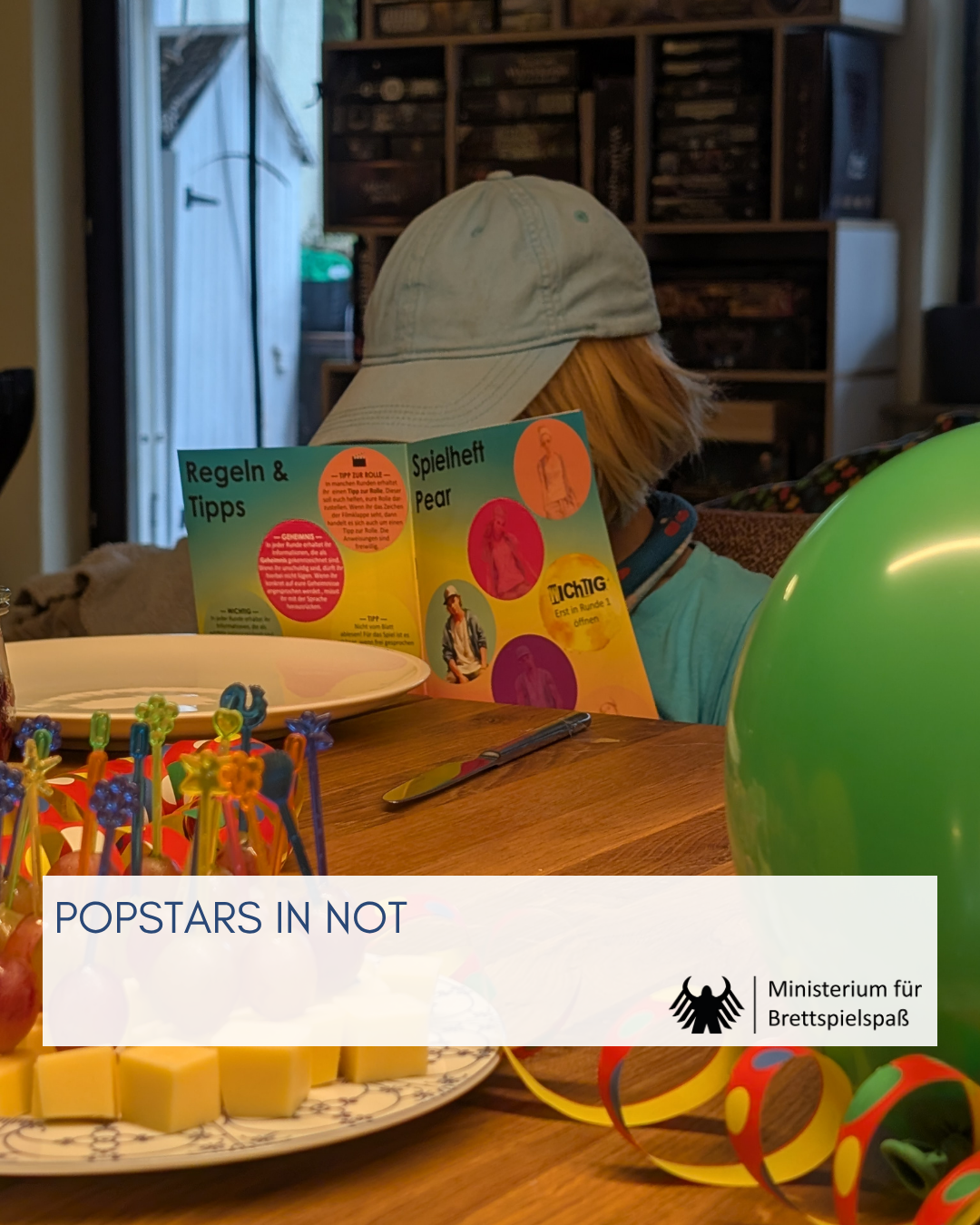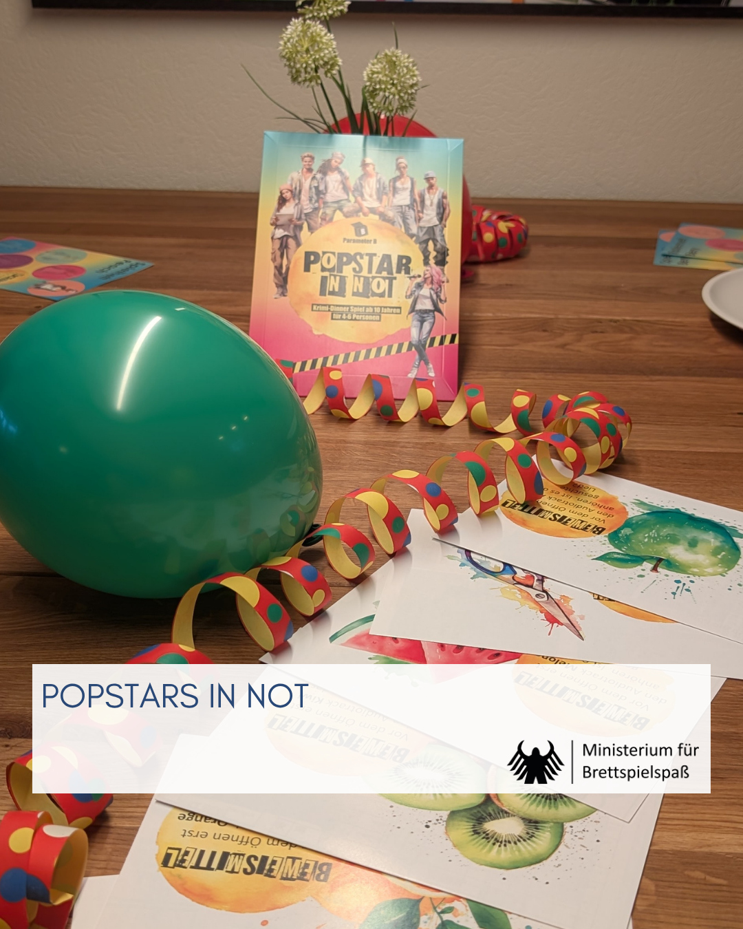 Doch ihr Interesse an den geheimnisvollen Abenden wuchs, und so freuten wir uns sehr, als wir auf der SPIEL 2025 am Stand von PARAMETER B ein Krimidinner entdeckten, das sich gezielt an Familien und erwachsene Einsteiger*innen richtet (und bereits 2023 erschienen ist): POPSTARS IN NOT.
