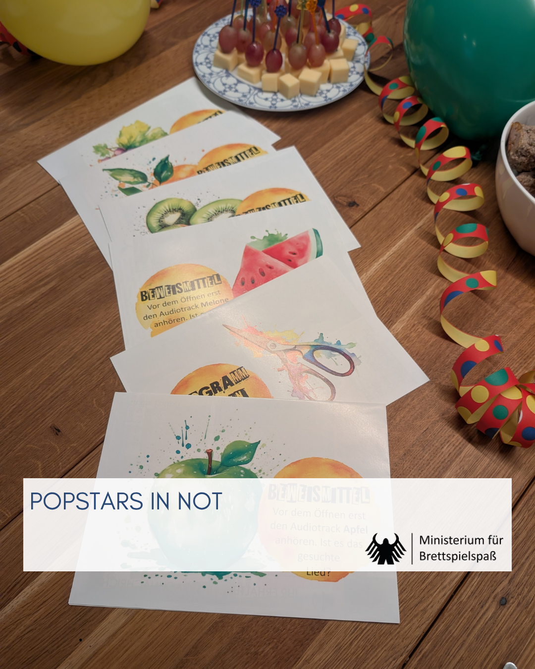 Zu bestimmten Zeitpunkten kommen zusätzlich zu den Charakterinformationen Hinweise ins Spiel. Auch dies ist hervorragend gelöst, denn welcher der Hinweise der richtige ist, muss erst mittels bekannter Lieder, die eigens für dieses Spiel produziert worden sind, entschlüsselt werden. Auch hier hatten wir viel Spaß beim gemeinsamen Raten.