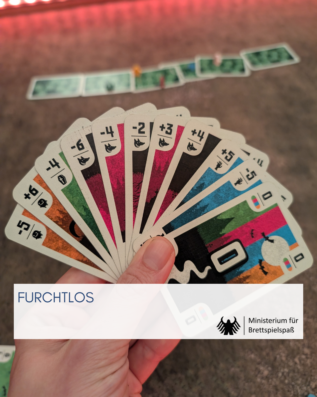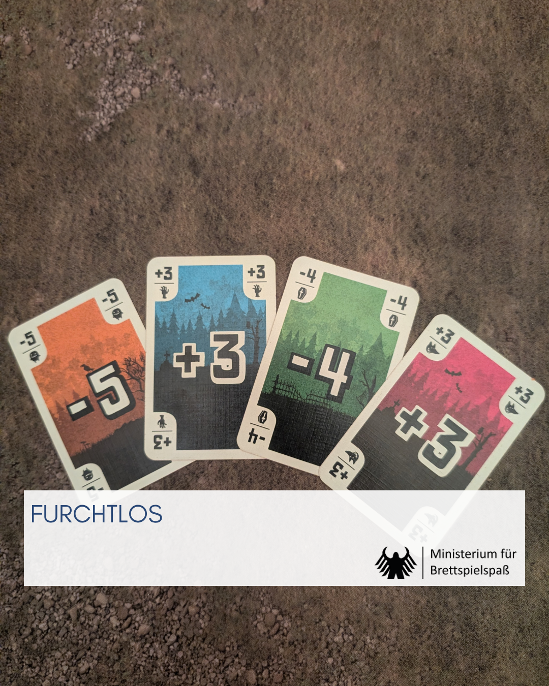 Doch die größte Gefahr lauert allerdings nicht im Wald, sondern am Spieltisch: in Gestalt meiner Mitspieler*innen. Und genau das macht für mich den Hauptspielreiz an FURCHTLOS aus. Nichts ist schöner als die anderen möglichst tief in den Wald zu entführen. Da in jeder Runde bekannt ist, welche Karten vorhanden sind (je nach Spieler*innenzahl werden manche rausgenommen und dann alle verteilt), lässt sich herrlich taktieren und spekulieren. Und wenn schon klar ist, dass eine Person einen Stich bekommen wird, lässt sich die Richtung natürlich noch manipulieren.