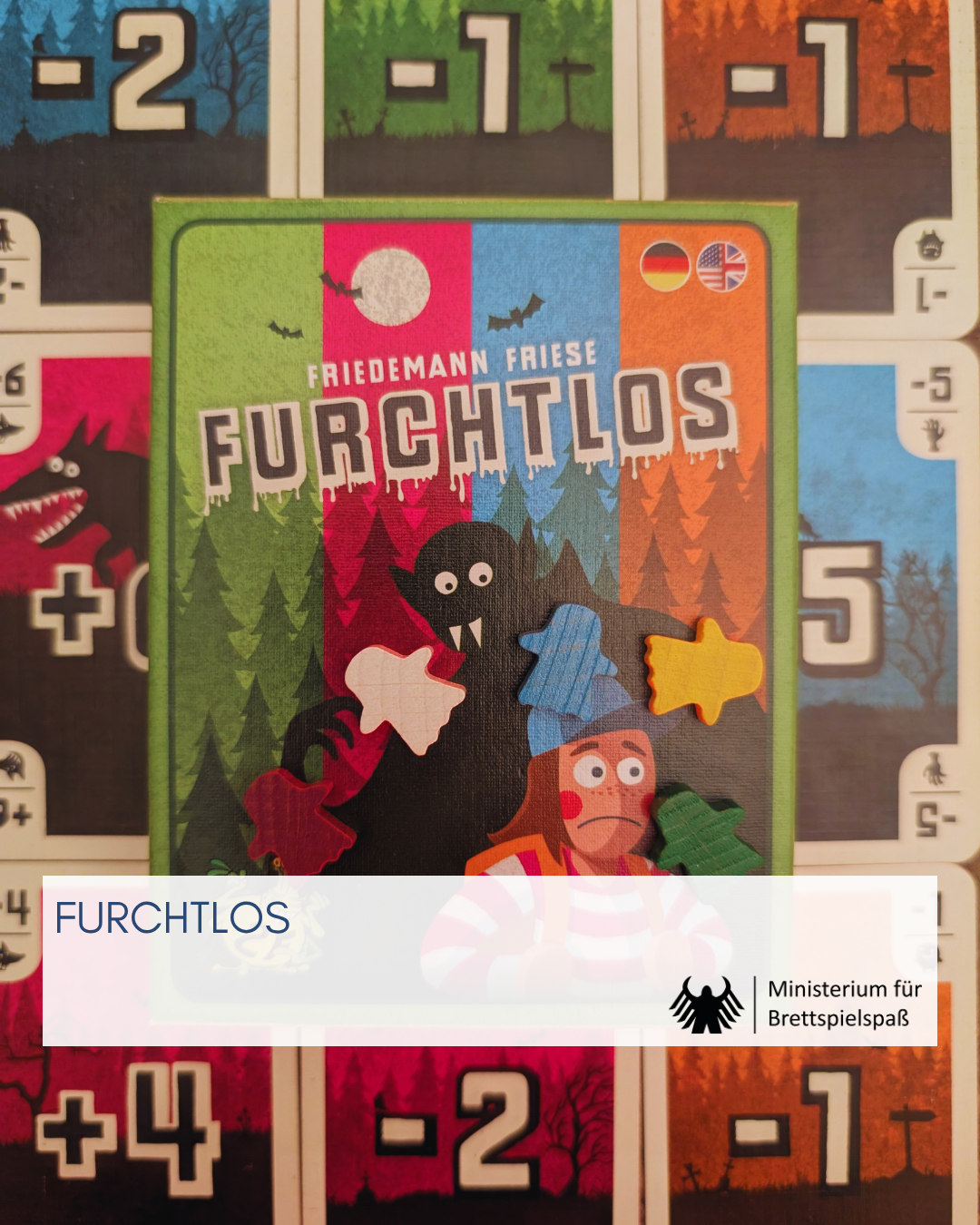 Für das Material hat FRIESE sich in diesem Jahr großzügig bei anderen Spielen bedient. In FURCHTLOS kommen die Geister aus NEBEL ÜBER CARCASSONNE zum Einsatz. Das passt gut und ist für mich sinnvolleres Recycling als es bei FORMIDABEL! der Fall ist (meine Rezension hierzu erscheint in der nächsten Ausgabe der FAIRPLAY). Ich fürchte, dass ich aber auch die Karten schon bald recyceln kann. Nach nur wenigen Partien sehen meine Karten deutlich mitgenommen aus. Das wird nicht lange halten.