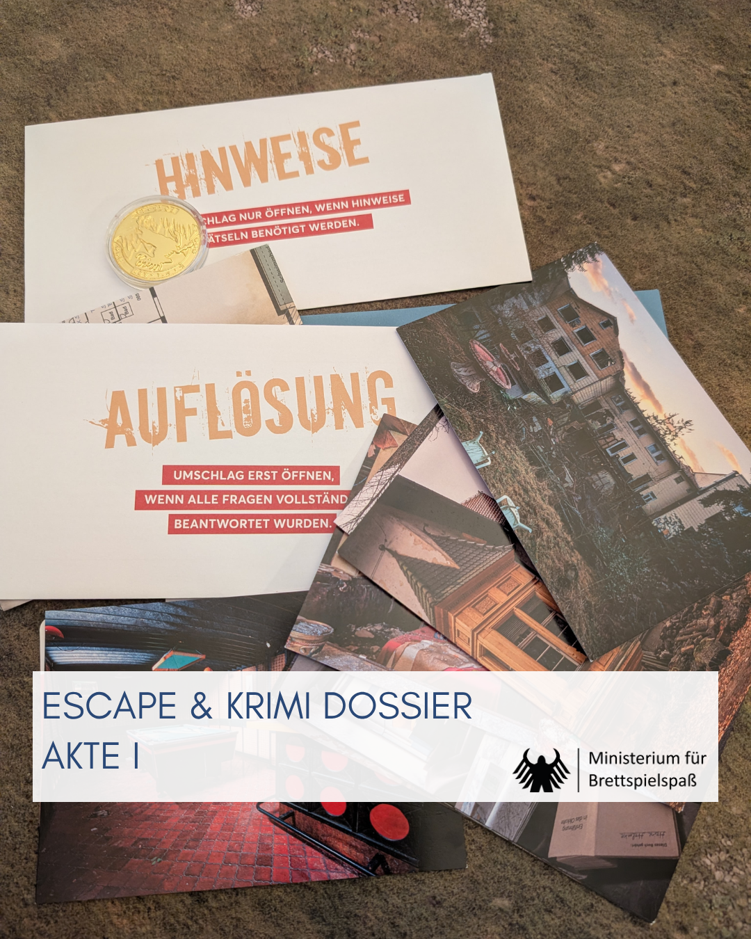 Die Schachtel hat ein anderes Format, doch das Prinzip der LOST PLACES RÄTSELBOX gleicht dem der CRIME FILES. Statt Polizeiarbeit übernehme ich hier einen Auftrag für eine Versicherung in einem Lost Place. Lost Places sind verlassene Orte wie Gebäude oder Industrieanlagen, die viele Menschen faszinieren. Auch ich war beim Geocaching eine Zeit lang gerne an solchen Orten unterwegs. Mittlerweile ist der damit verbundene Hausfriedensbruch verjährt und ich kann es hier frei zugeben. Wer sich für das Thema interessiert und auf der sicheren Seite bleiben möchte, kann zu diesem Krimispiel greifen. Mit „14 echten Lost-Places-Fotos“ wirbt der Verlag und vermittelt eine gewisse Exklusivität, auch wenn das Internet längst voller entsprechender Aufnahmen ist. Der tatsächliche Reiz des Falls liegt für mich damit vielmehr in der gelungenen Verbindung von Thema und Rätseln. Überfordert wurde ich dabei nicht.