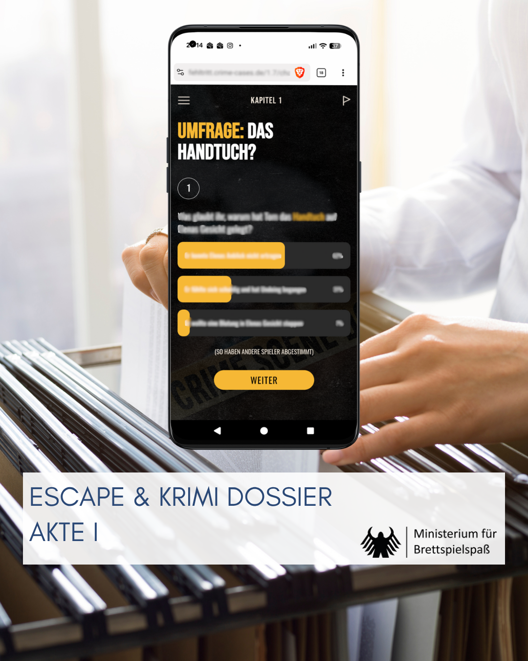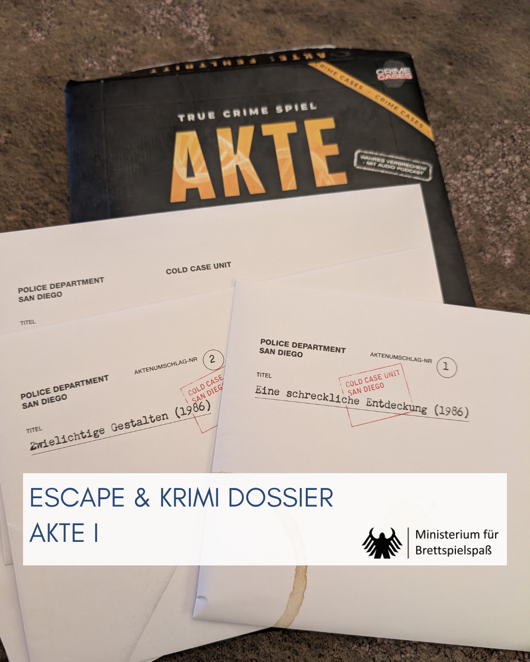 Welches Potenzial in einer gut gestalteten Website und der Zusammenarbeit mit einem Podcast steckt, zeigt die AKTE FEHLTRITT. Für uns war es der erste Umschlag dieses Verlags, weshalb wir keine klare Vorstellung von Umfang und Aufbereitung hatten. Und obwohl sowohl meine Frau als auch ich neben Brettspiel-Podcasts gern True Crime hören, kannten wir den beteiligten Podcast MORD HOCH ZWEI, der seit Oktober 2024 regelmäßig erscheint, vorher nicht. Offen gesagt, schwang anfangs die Sorge mit, dass diese Verbindung ähnlich holprig geraten sein könnte wie beim ECHOES-Teil mit MORD AUF EX. Das erwies sich jedoch schnell als unbegründet.