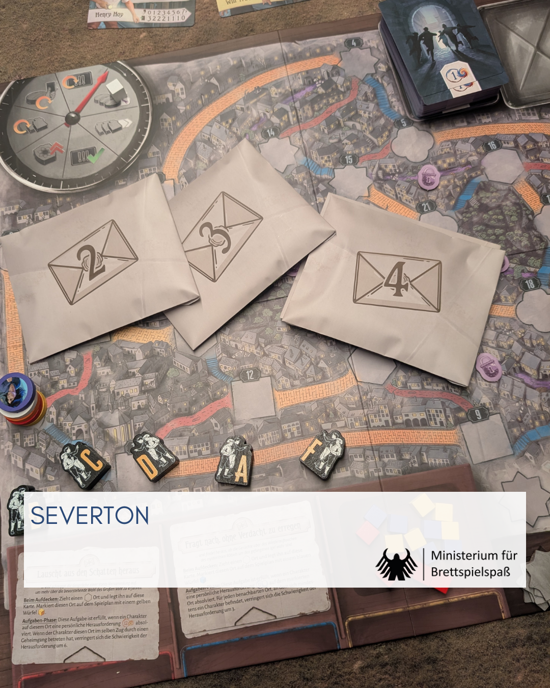 Spiele ich mit weniger als fünf Mitspieler*innen, hat eine Person einen Doppelcharakter. Zu zweit steuert so eine Person einen Charakter, eine Person den Doppelcharakter und die übrigen beiden Charaktere werden gemeinsam benutzt. Auf diese Weise muss das Spiel nicht für Spieleranzahlen skaliert werden. Es gibt für mich aber auch kaum Grund, es mit mehr Personen auszuprobieren. Die individuelle Spielerfahrung wird dadurch nur limitiert. Leider versäumt die ansonsten solide Anleitung an mehreren Stellen auszuführen, wie mit den neu eingeführten Mechanismen bei den gemeinsam gespielten Charakteren verfahren wird. So gibt es zum Beispiel individuelle Aufgaben, die eigentlich geheim gehalten werden sollten. Ich habe es jetzt so gespielt, dass auch die gemeinsamen Charaktere offene Aufträge bekommen haben. Aber ob das richtig war… Zumindest hat es funktioniert.