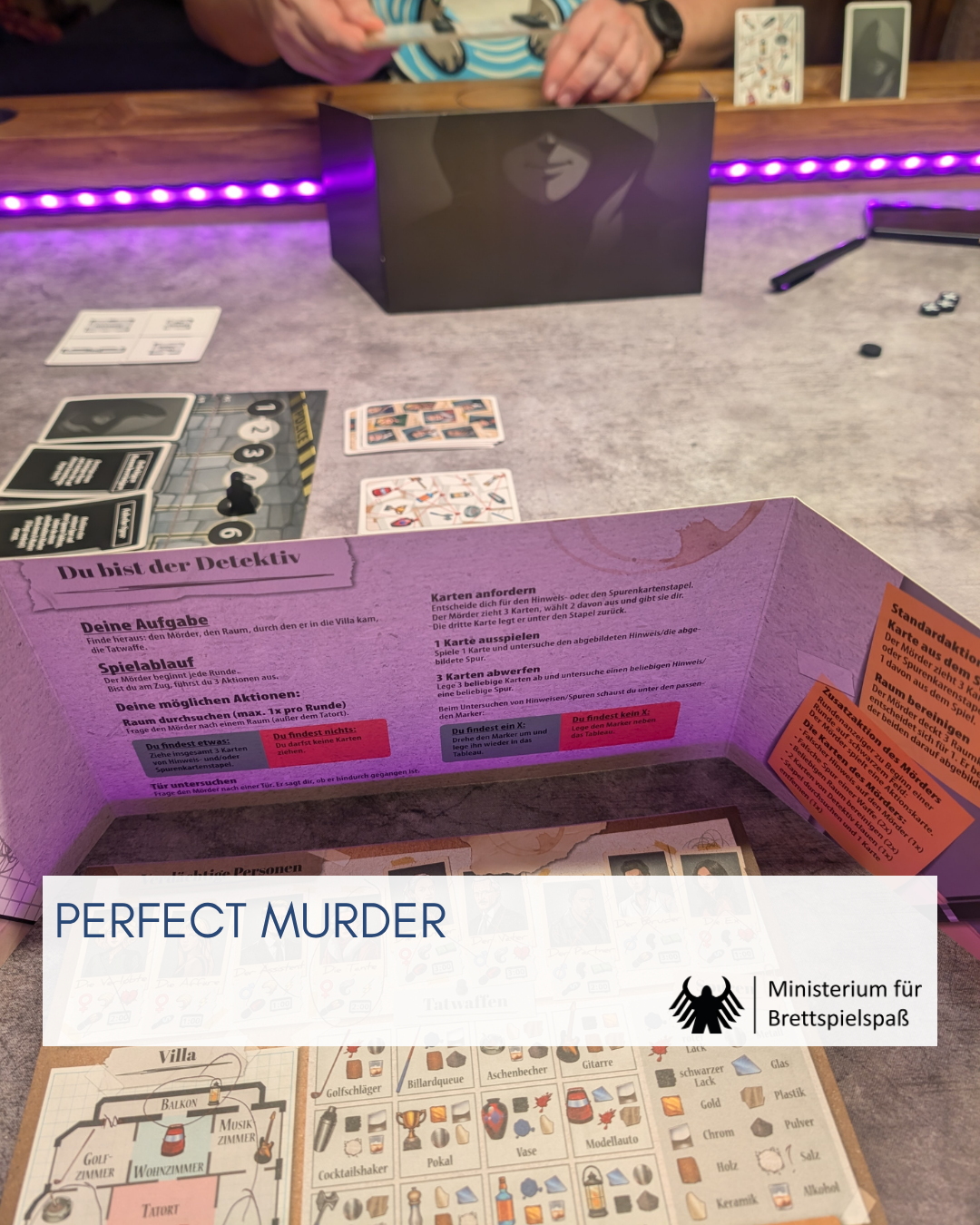 Karten gibt es auch in PERFECT MURDER. Zuerst werden aber die Rollen verteilt. Eine Person spielt Mörder*in, die andere Detektiv*in. Schön gemacht: Eine Losspielanleitung führt durch den Aufbau und erklärt dann kurz und knapp das Spielsystem. Der*die Mörder*in muss einen Weg durch eine Wohnung einzeichnen und festlegen, wer mit welchem Gegenstand den Finanzmogul Xavier Sterling umgebracht hat. Anschließend folgen acht Runden im wechselseitigen Schlagabtausch. Das System ist asymmetrisch: Der*die Mörder*in hat immer nur ein bis zwei Aktionen; er*sie verwischt Spuren, um Räume vor Durchsuchungen zu schützen, oder lässt Hinweise verschwinden. Im Gegenzug darf der*die Detektiv*in gleich drei Aktionen auslösen – etwa Spurkarten ziehen oder den*die Mörder*in nach Wegpunkten befragen, was dieser wahrheitsgemäß beantworten muss.