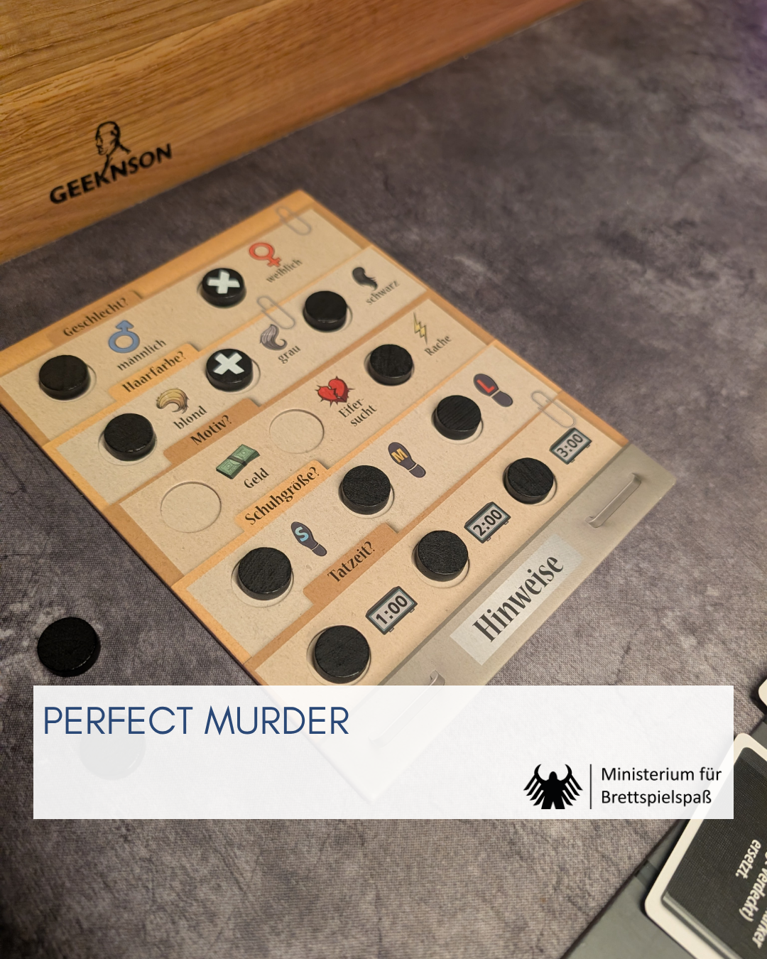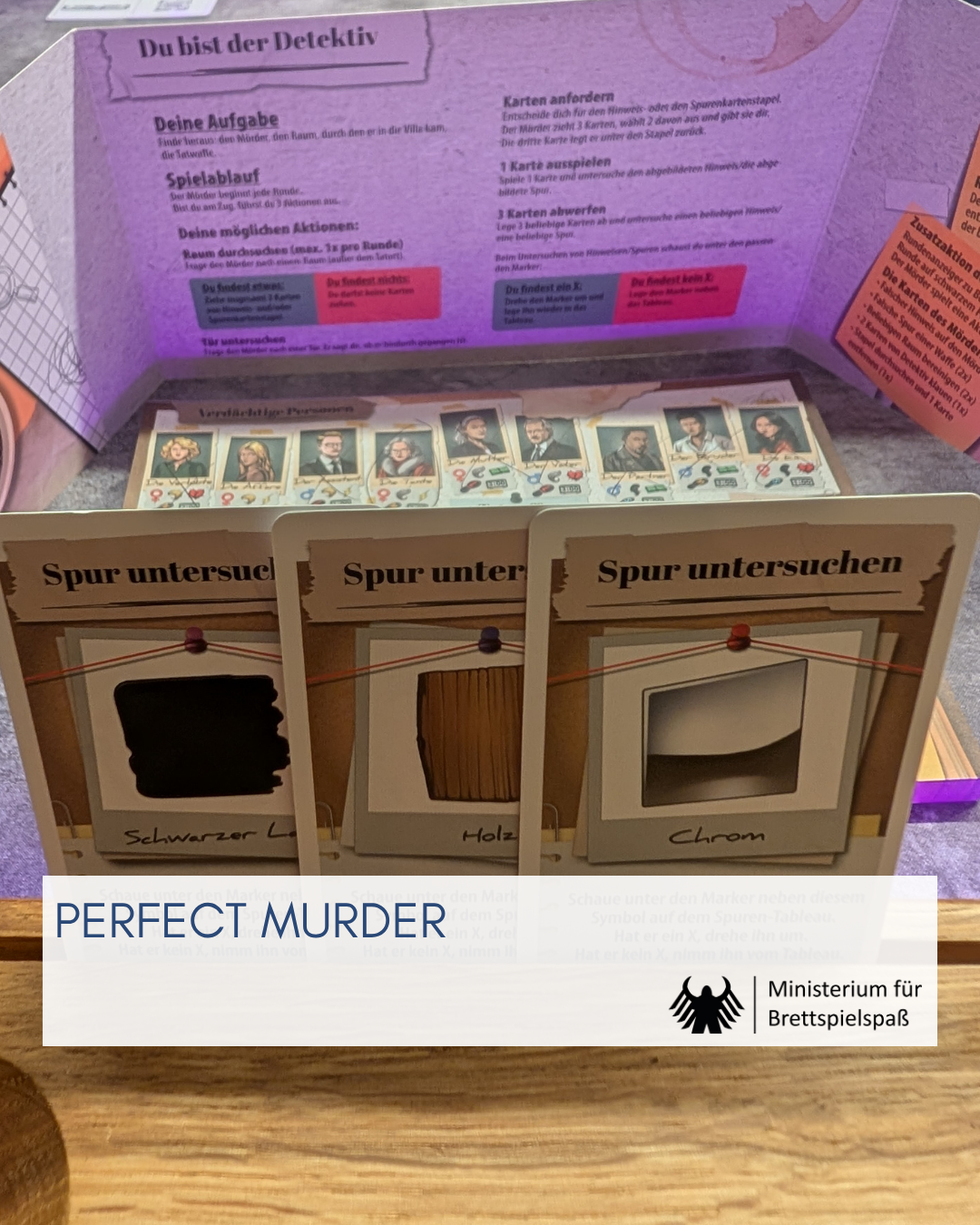 Im Prinzip ist dies auch schon das Dilemma des Spiels: Ich spiele nicht wirklich miteinander. Aber auch nicht gegeneinander. Die Mörderfigur ist nur Projektionsfläche für das Logikrätsel, das der*die Detektiv*in zu lösen versucht. Die Hauptaufgabe des*der Mörder*in ist mit dem Aufbau abgeschlossen. Das anschließende Taktieren bleibt dekoratives Beiwerk; spielerisch fühlte sich die Mörderrolle für mich nicht sonderlich interessant an.